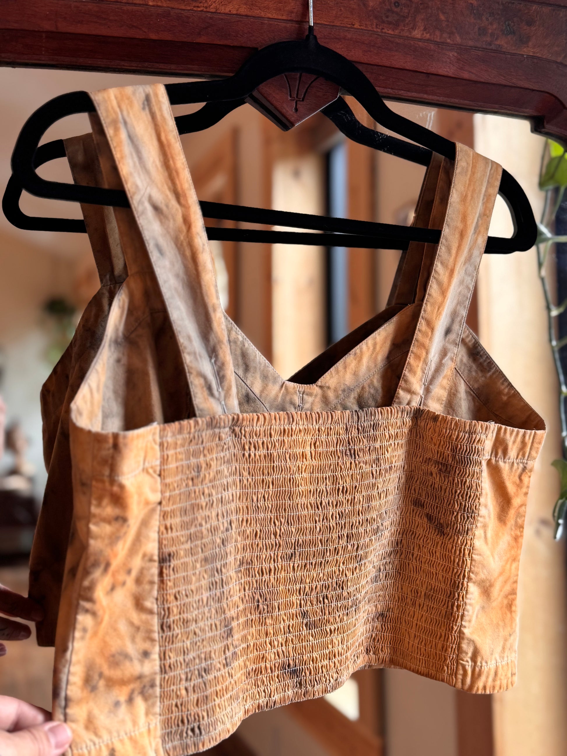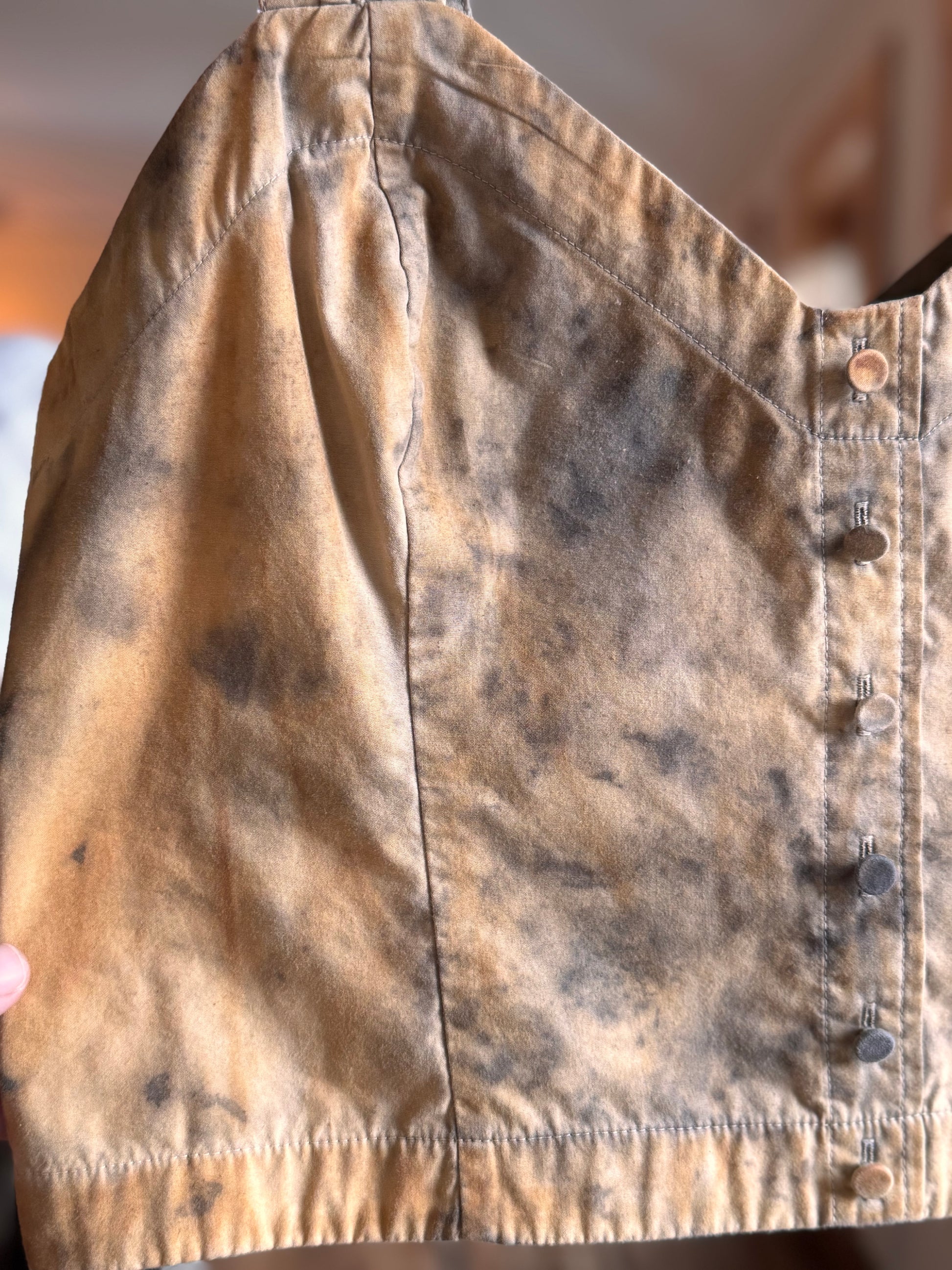Most of these hand selected upcycled garments are 100% cotton with slight variations including rayon and silk. Bathed in a mix of water and walnuts, with possible steely rust water treatment