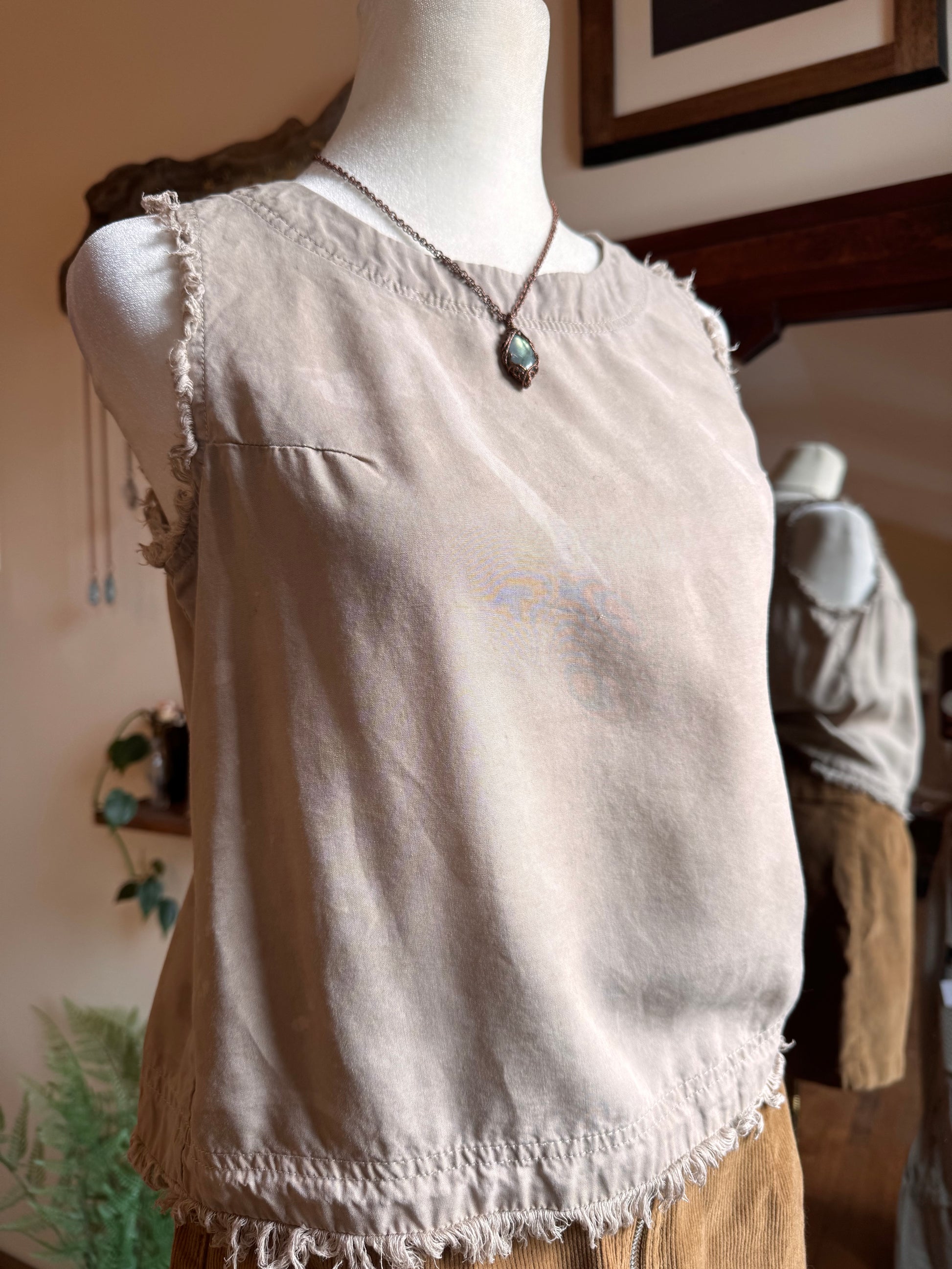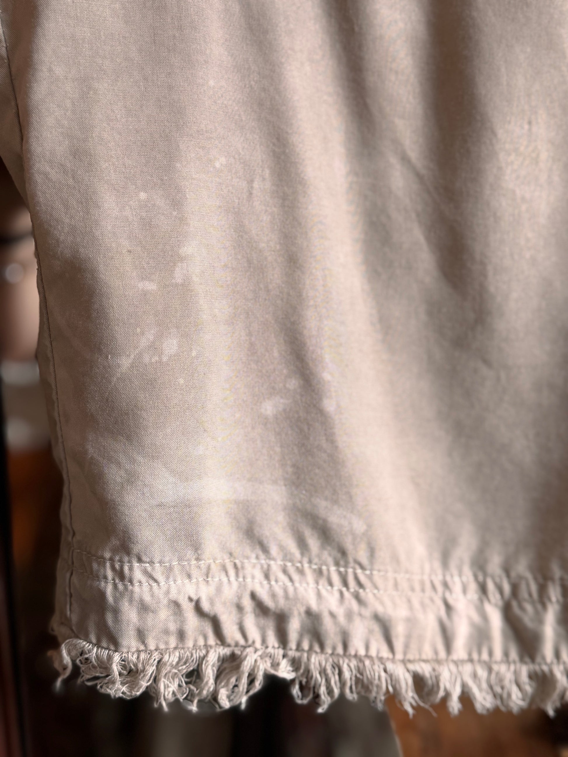 Most of these hand selected upcycled garments are 100% cotton with slight variations including rayon and silk. Bathed in a mix of water and walnuts, with possible steely rust water treatment
