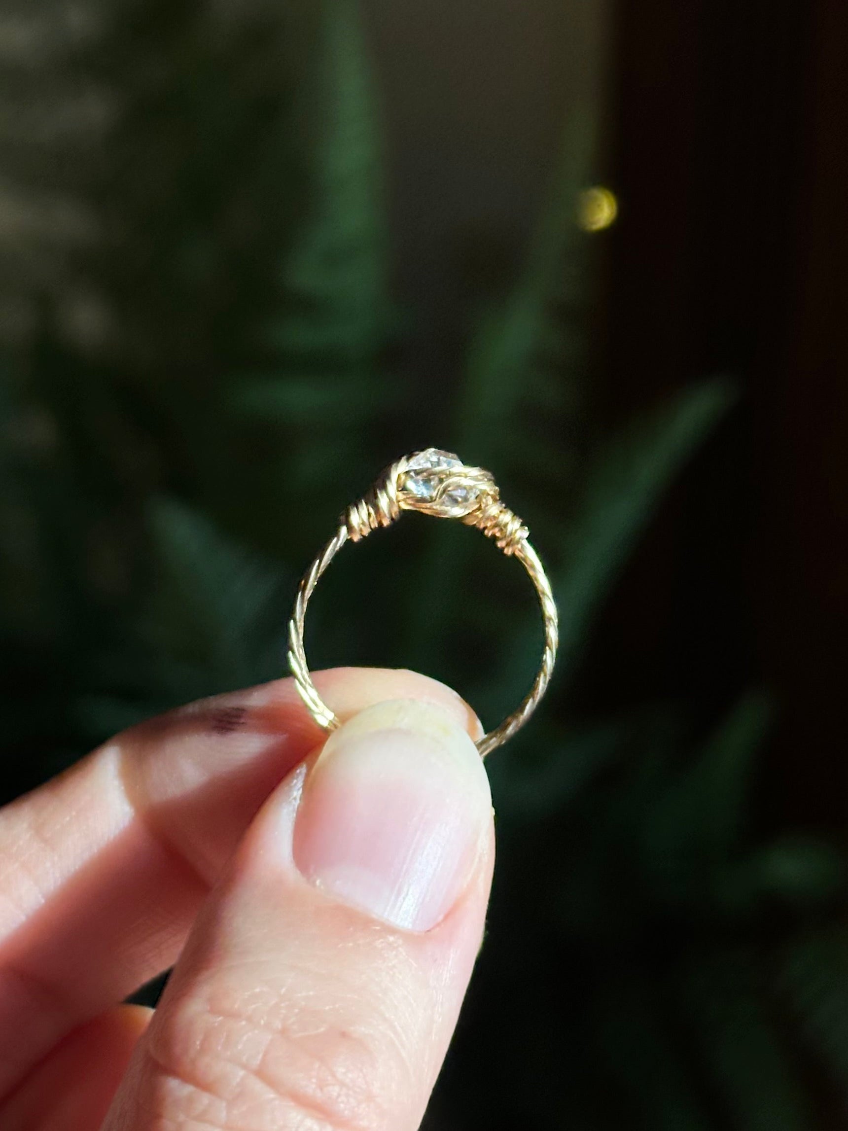 Genuine Raw Herkimer diamond ring expertly wrapped in 14k gold
