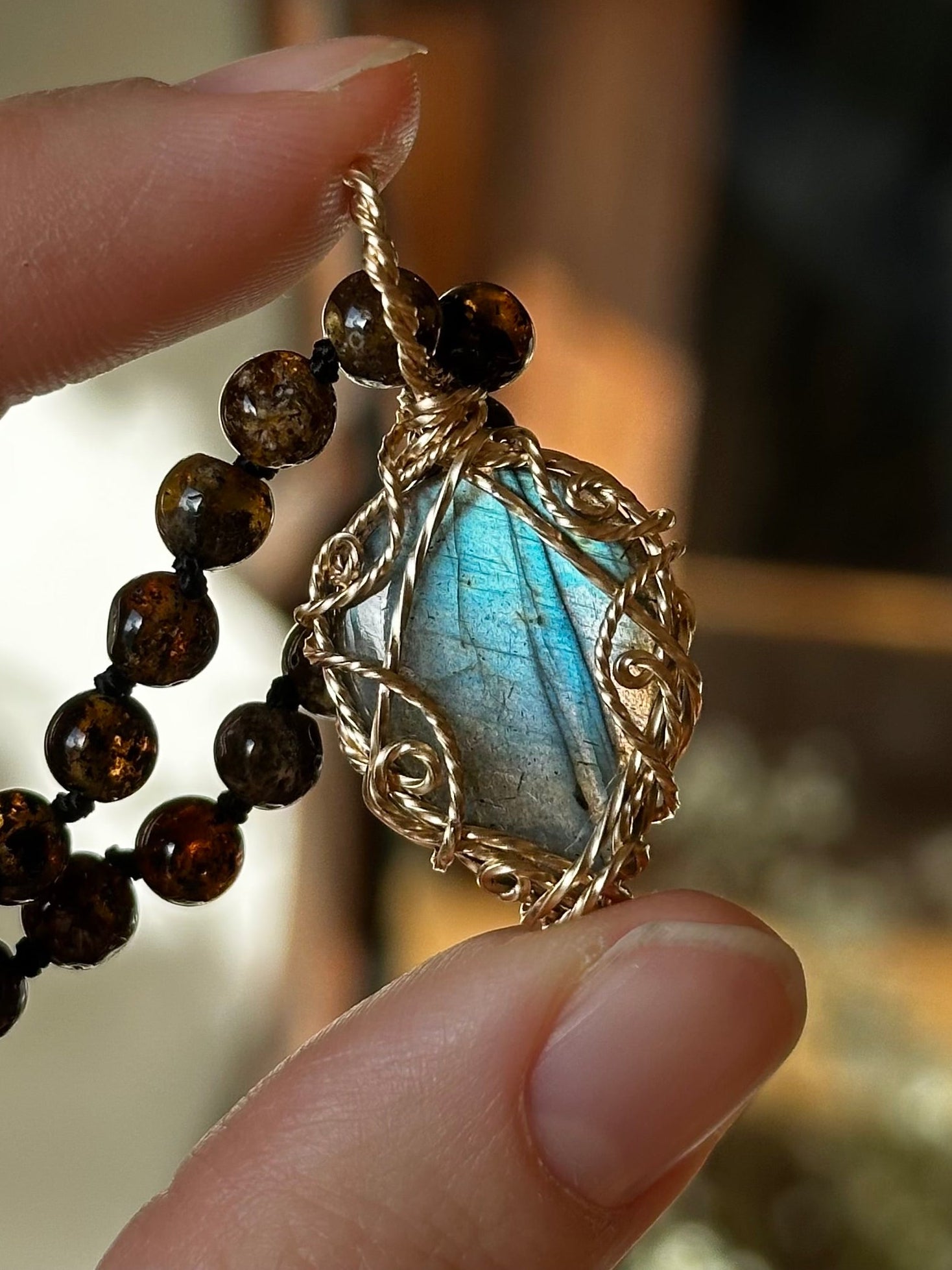 Labradorite Druid in Gold ~ Baltic Amber Chain