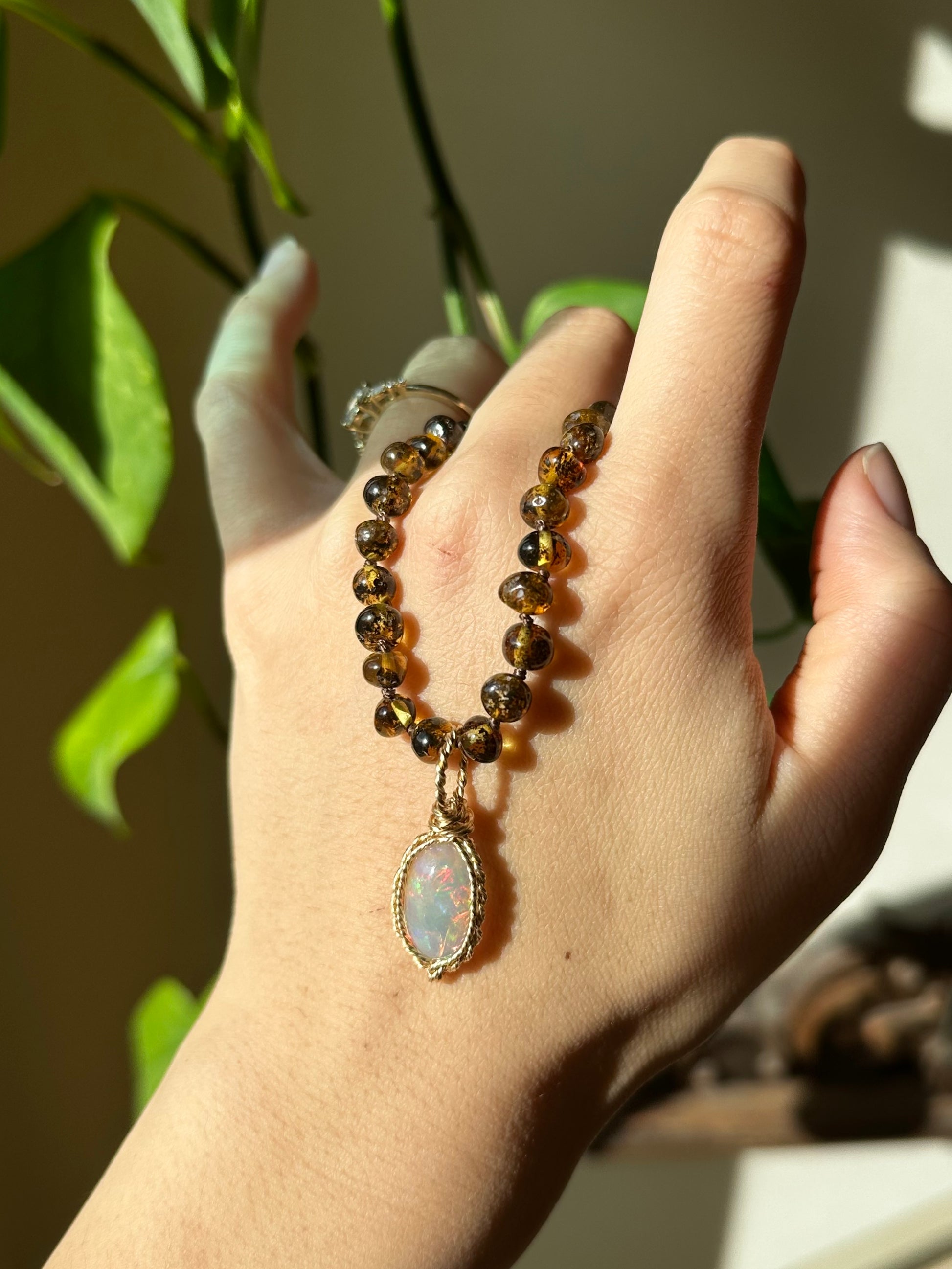 Bold & beautiful opal set in 14k gold on a Baltic Amber Chain
