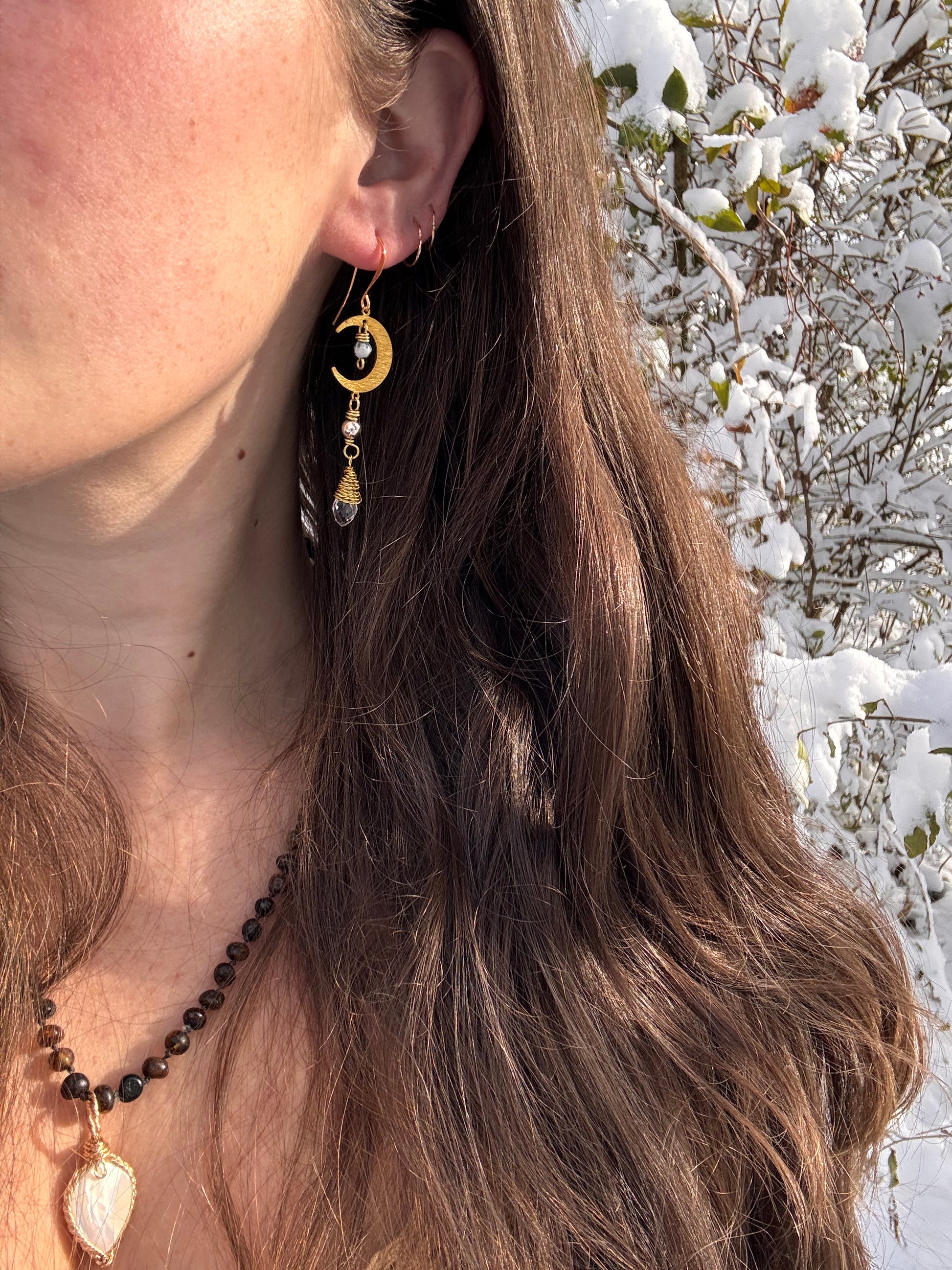 who doesn’t love the moon? Light every day charming earrings made with brass and moss agate